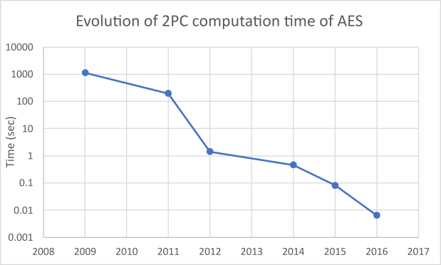 This graph shows the time of a two-party secure computation of the AES block cipher over the years. That is the time it takes to evaluate AES(k,x), where one party holds a 128-bit key k to the block cipher, the other party holds a 256-bit data block x, and the output is 256-bit long. The measurements are from the original papers. There are different variants of this “benchmark”, in terms of the number of parties (2PC/MPC), the number of corrupted parties (honest/dishonest majority), precise security model (semi-honest/fully malicious), hardware, network (LAN/WAN), and cost model (single/batch execution), but, for concreteness, the graph only includes results in the batch-evaluation setting in the fully malicious two-party setting.