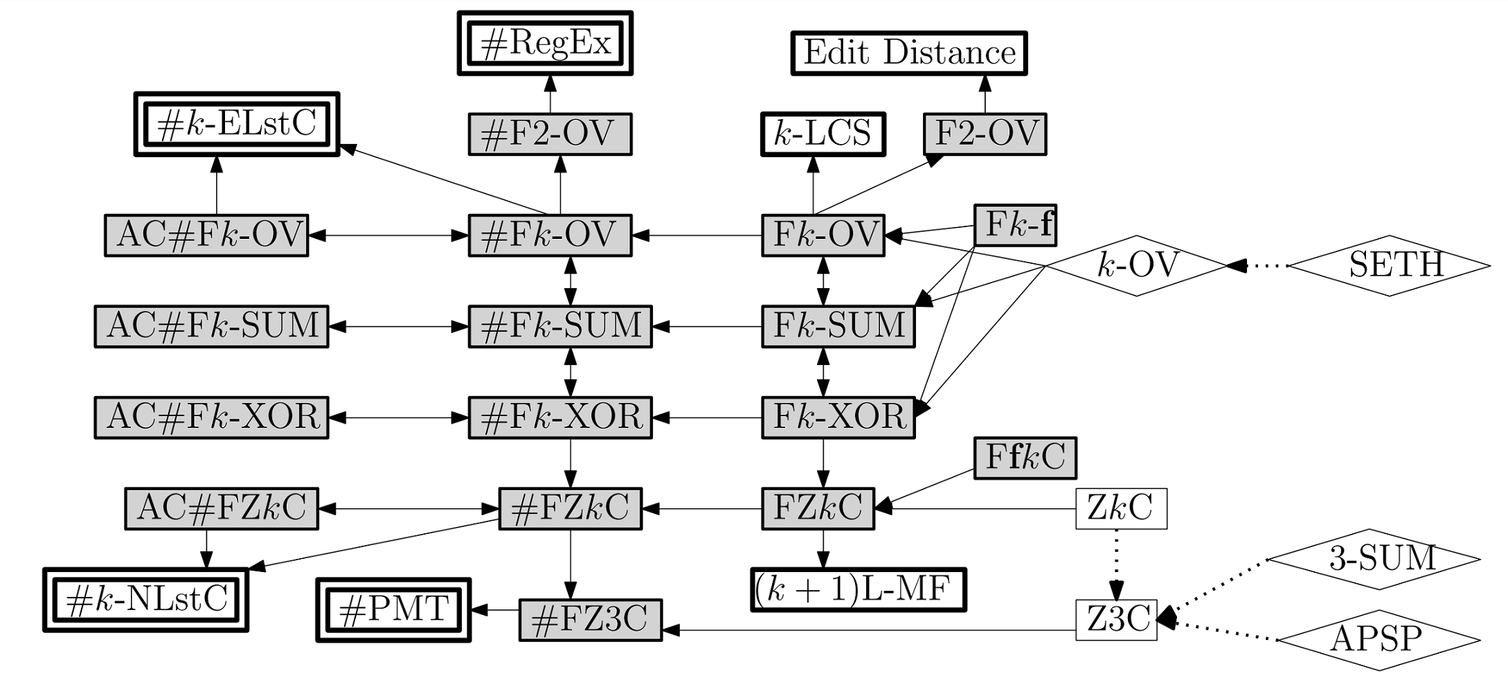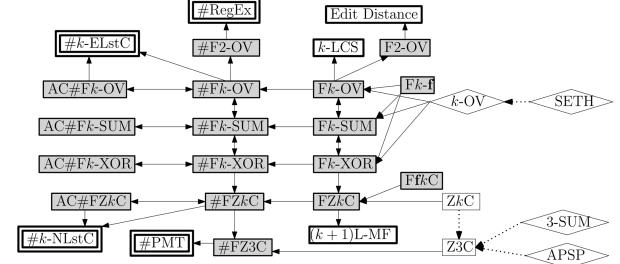 Instead, can we first come up with a nice combinatorial problem that encodes OV on a slightly larger binary input space and then construct a “good” polynomial for counting solutions of this combinatorial problem? (The motivation is that since this combinatorial problems encodes OV, it is at least as hard as OV for worst case, and moreover, if we can construct a “good” polynomial for counting solutions of this combinatorial problem, by the new recipe in the previous post, counting solutions of this combinatorial problem for average case is (almost) as hard as that for worst case. Therefore, counting solutions of this combinatorial problem for average case is at least as hard as OV for worst case. More importantly, this combinatorial problem could serve as the source of reductions thanks to its combinatorial structure.) The factored OV problem introduced in [DLW20] gives a positive answer to this question. Analogously, they proposed factored variants for many other flagship fine-grained hard problems. By reductions to these factored problems, they managed to prove average-case fine-grained hardness for many natural combinatorial problems such as counting regular expression matchings (the featured image of this post is the web of reductions in their paper).